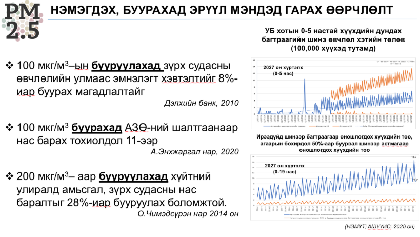 Өнгөрсөн жил болсон утааны сонсголын үеэр АШУҮИС-ийн судлаач А.Энхжаргал утаа агаарын бохирдлыг тодорхой хэмжээгээр бууруулахгүй бол астма болон багтраа өвчний тохиолдол 2027 онд эрс нэмэгдэнэ гэсэн судалгааг гаргажээ. Түүнчлэн агаарын бохирдлоос үүдэлтэй хүүхдийн цусан дахь хар тугалгын хэмжээ нэмэгддэг гэдгийг олон улсын судлаачид хийгээд НҮБ-ын Хүүхдийн сангаас анхааруулсан. Манай улсын хувьд 2016 онд хүүхдийн цусан дахь хар тугалгын хэмжээг тодорхойлох судалгааг хийжээ. Энэ үед ундны уснаас үүдэлтэй хар тугалгын хэмжээ өндөр байна гэсэн дүгнэлт гаргаж байжээ. Харин үүнээс хойш хүүхдийн цусан дах хар тугалгын хэмжээг тодорхойлох судалгаа хийгээгүй байна. Агаарын бохирдол нь хүүхдийн эрүүл аюулгүй орчинд амьдрах амь насаа хамгаалуулах эрхийг ноцтойгоор зөрчиж байна гэсэн мэдэгдлийг НҮБ-ын Хүүхдийн сангаас гаргадаг ч Монгол Улсын төр үл тоомжирлон өнгөрөөдөг аж. Ийн нэг намын эрх ашиг давамгайлсан тогтолцооны золиос нь иргэд боллоо.